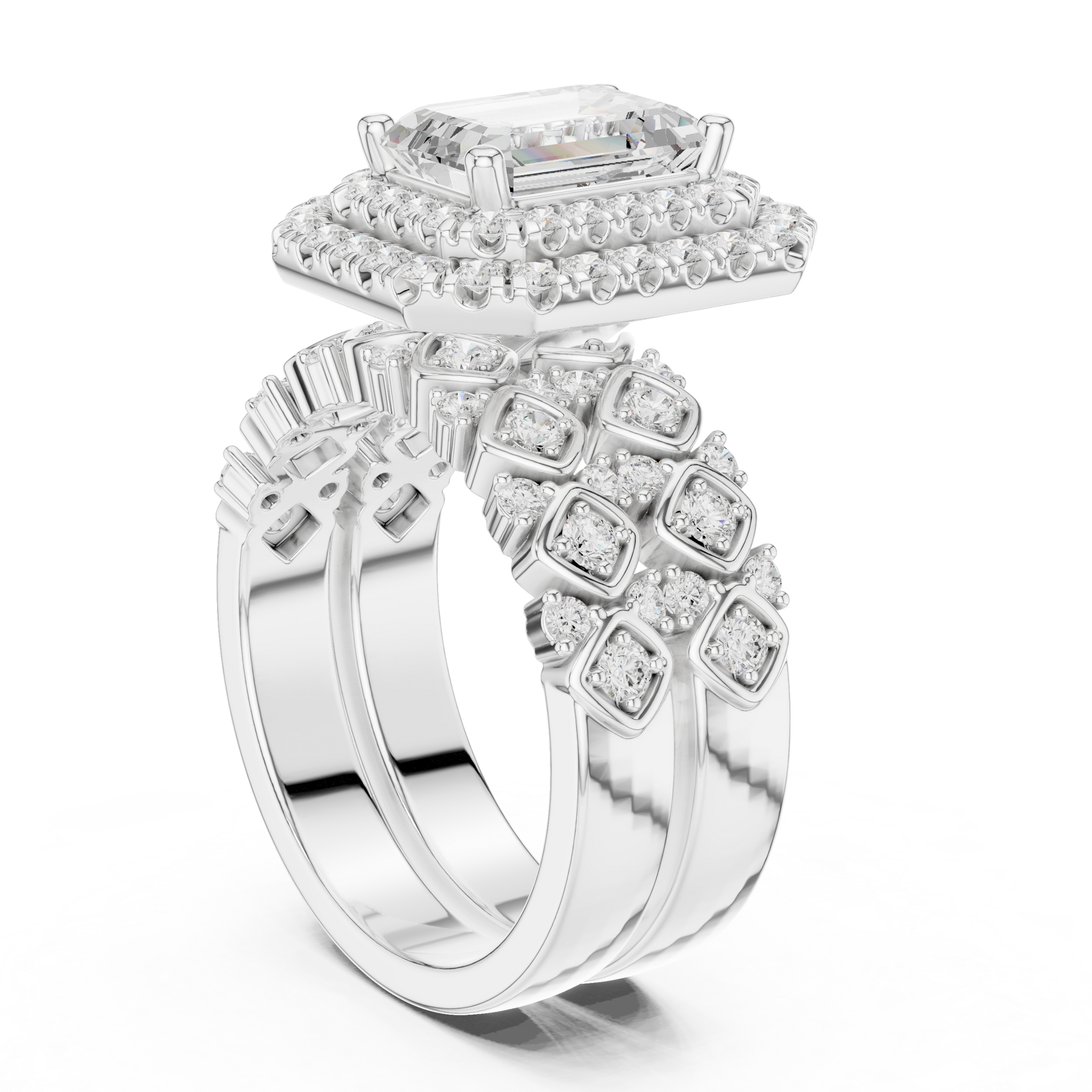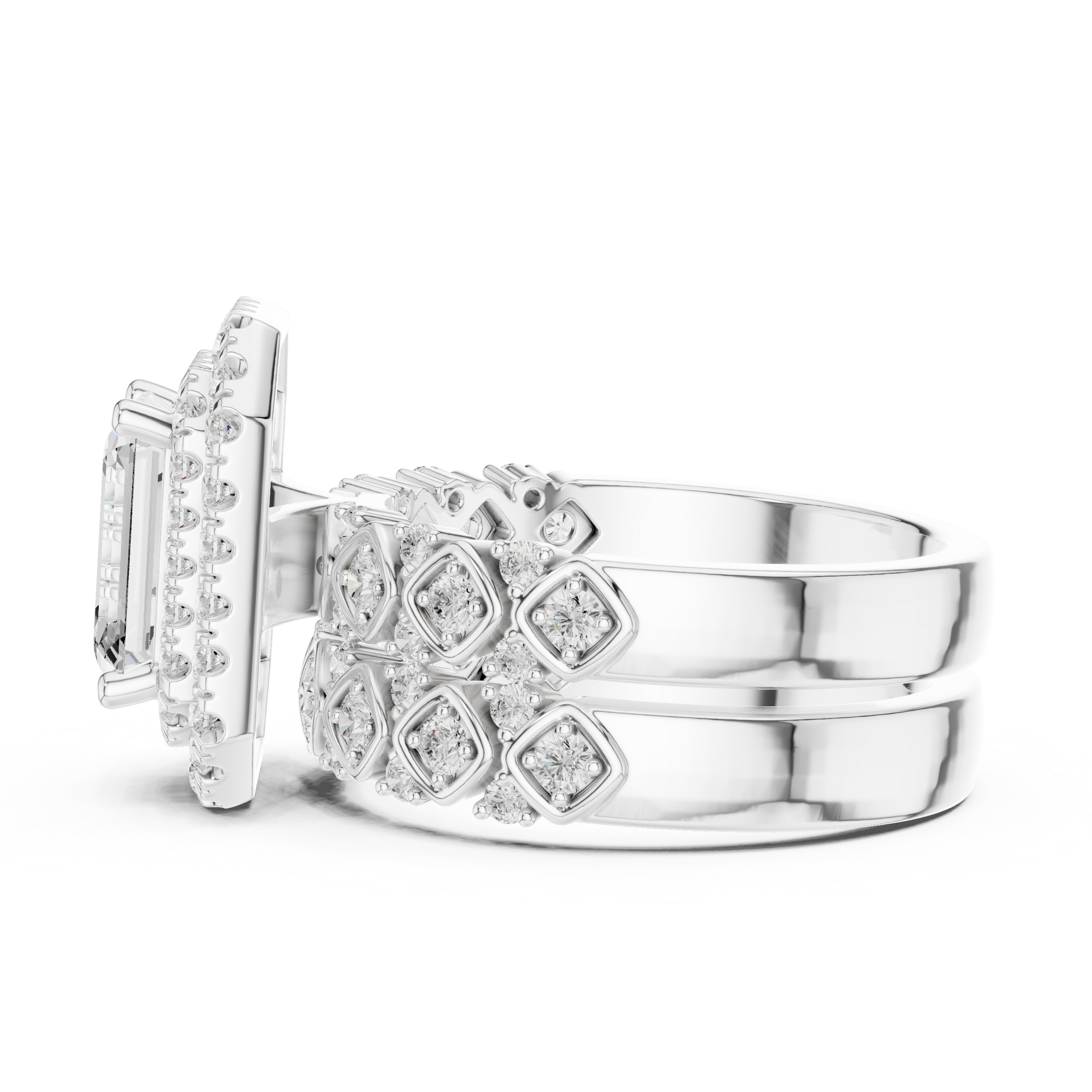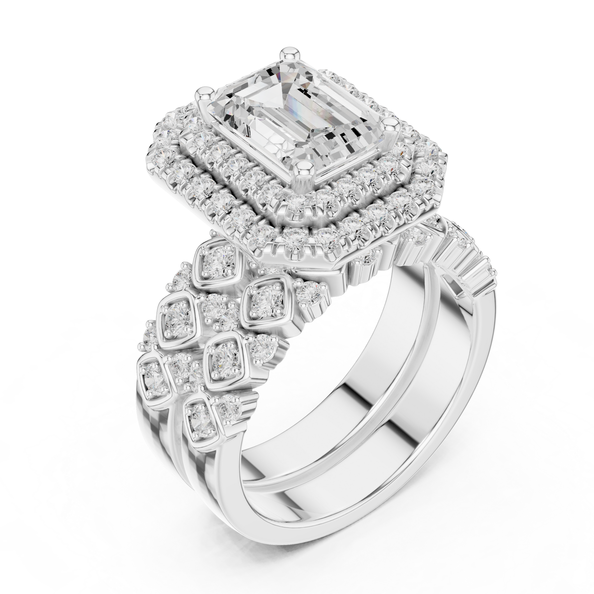 Discover the brilliance of a certified lab diamond ring from Siyaara.com. This exquisite piece is crafted to reflect The Lattice Double Halo is a study in parallel lines and architectural strength. This ring reimagines the traditional trilogy design by focusing on the hall-of-mirrors effect of step-cut stones. Centering an elongated emerald-cut stone, the design creates a continuous, high-shine surface that wraps elegantly around the finger. It is a piece for those who find beauty in structural order and quiet luxury.