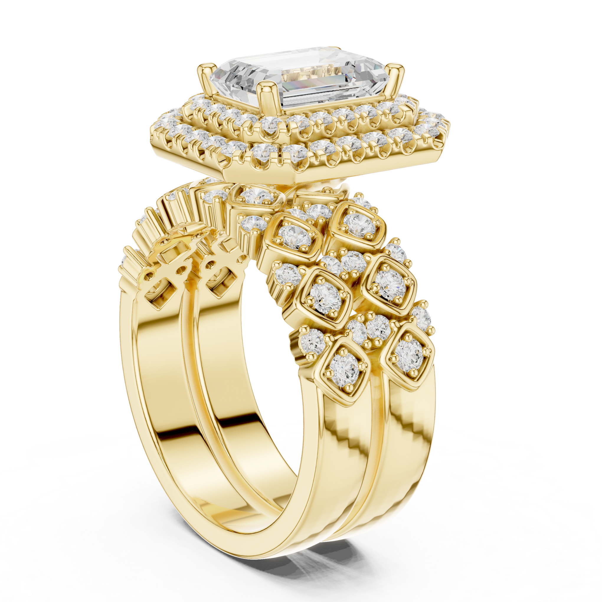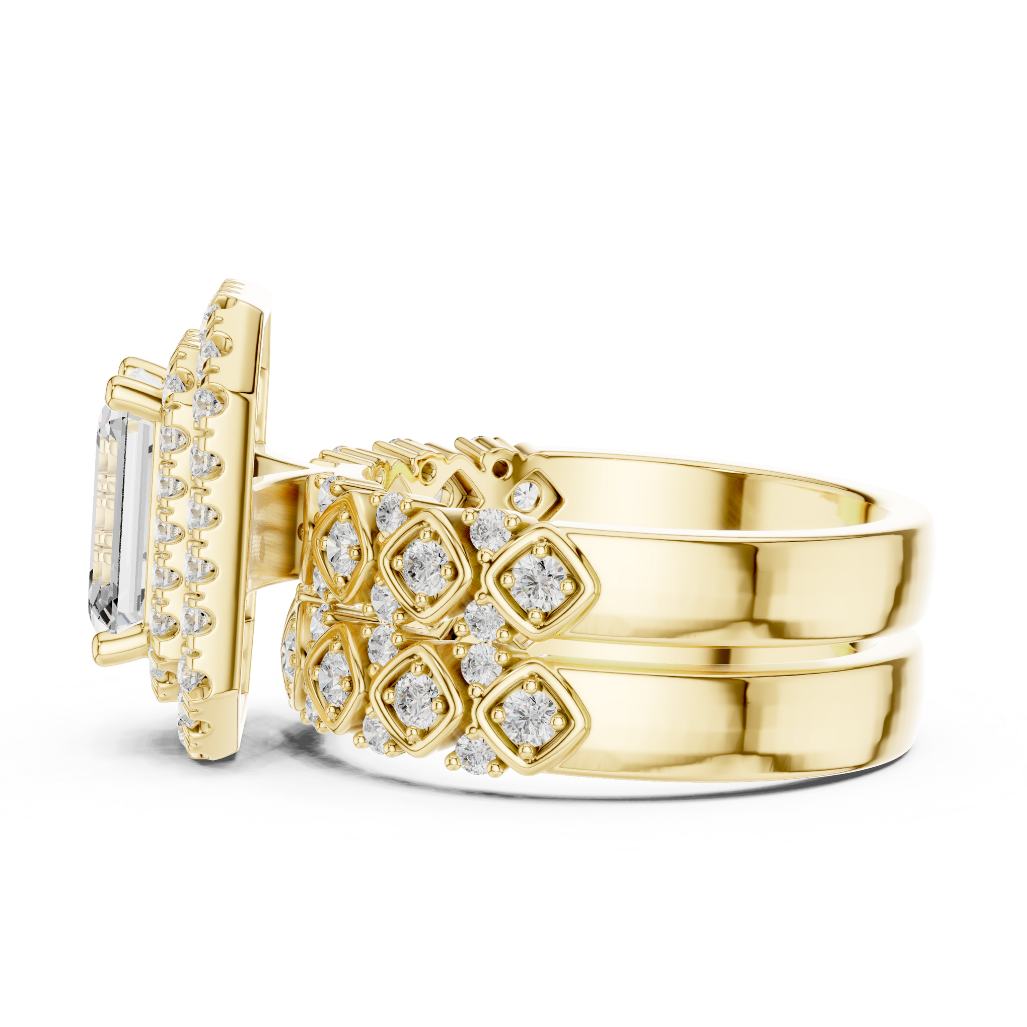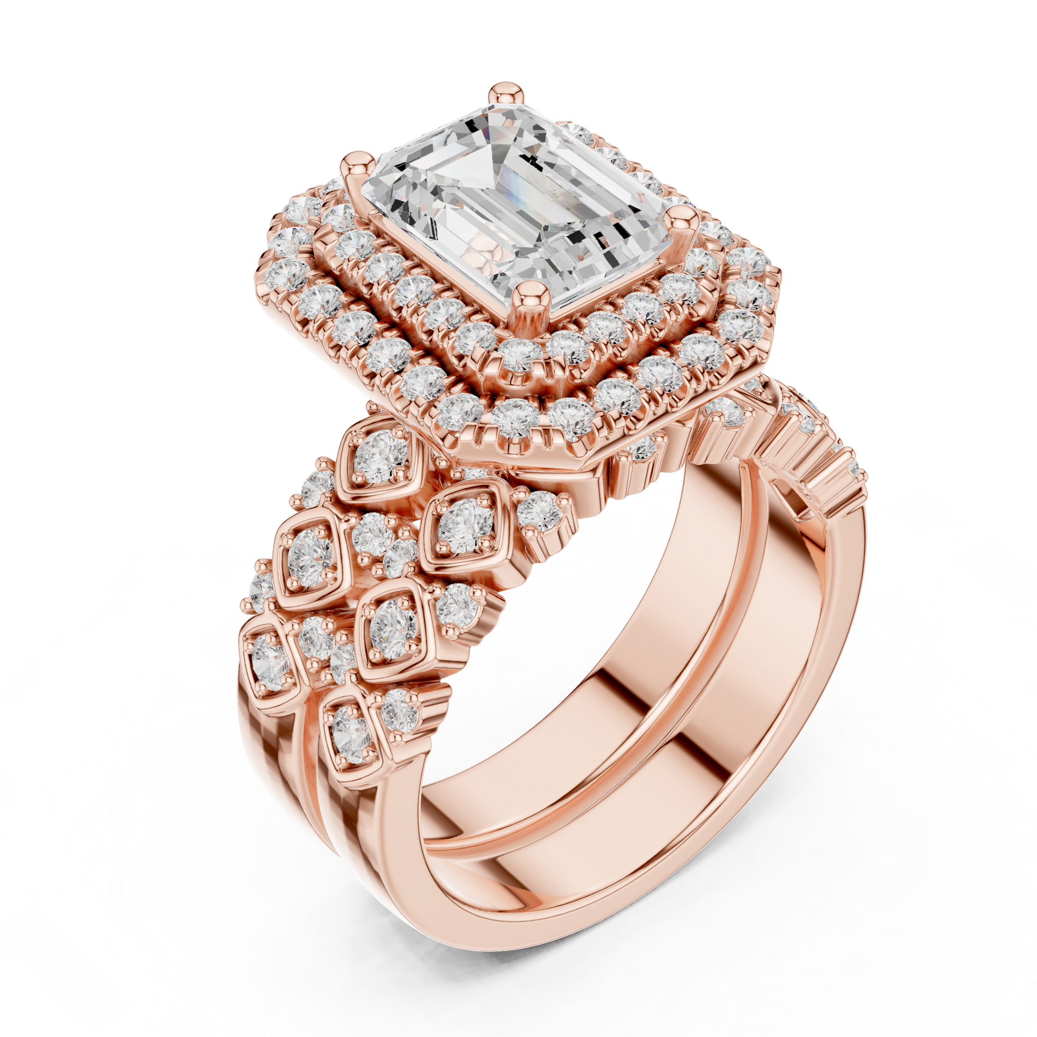 Discover the brilliance of a certified lab diamond ring from Siyaara.com. This exquisite piece is crafted to reflect The Lattice Double Halo is a study in parallel lines and architectural strength. This ring reimagines the traditional trilogy design by focusing on the hall-of-mirrors effect of step-cut stones. Centering an elongated emerald-cut stone, the design creates a continuous, high-shine surface that wraps elegantly around the finger. It is a piece for those who find beauty in structural order and quiet luxury.